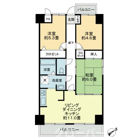 和室 6.0帖/洋室 5.3帖/洋室 4.6帖 - 向き