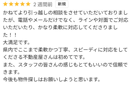 県内でここまで柔軟かつ丁寧、スピーディに対応をしてくださる不動産屋さんは初めてです。